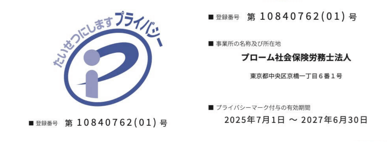 プローム社会保険労務士法人は、2025年7月1日付けで「プライバシーマーク(Pマーク)」認定を取得いたしました。